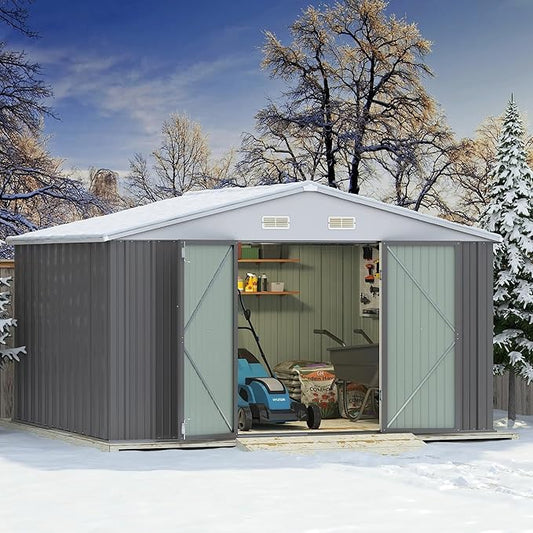 Greesum 10×8FT Outdoor Storage Shed, Metal Patio Storaged Sheds with Lockable Doors, Sheds & Outdoor Storage for Bike, Backyard, Pool and Garden, Gray