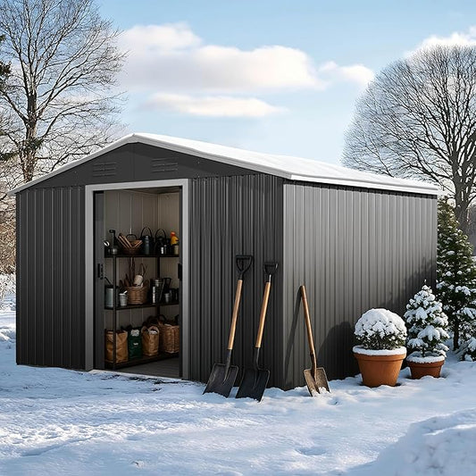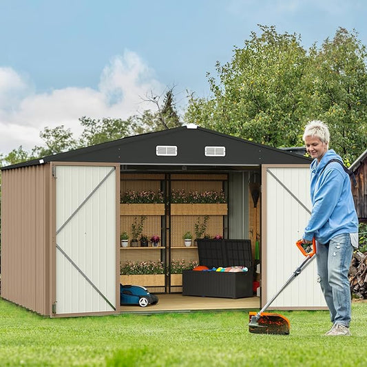 GUNJI 10 x 8 FT Shed Outdoor Storage Shed Metal Garden Shed with Lockable Door Outside Waterproof Tool Shed for Backyard, Patio, Lawn (Brown)