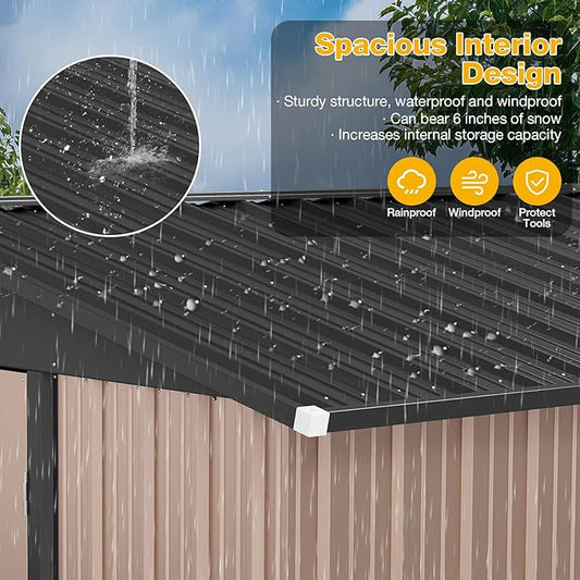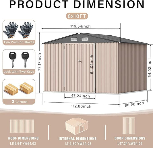 Outdoor Tool Shed 8x10 FT Heavy-Duty Metal Storage Shed with Lockable Door, Windows & Ventilation - Weather-Resistant Roof Garden Shed for Backyard, Patio, Lawn (Brown)