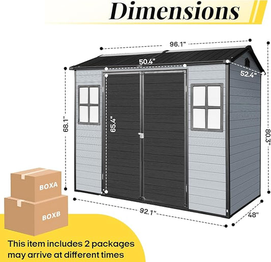 8x4 FT Resin Storage Sheds Outdoor with Floor Included, Plastic Sheds & Outdoor Storage Clearance with 2 Windows and Lockable Door, Backyard Storage Sheds for Garden Tools, Bike, Black+Grey