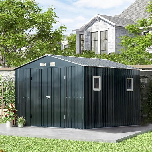 10x12 FT Outdoor Storage Shed, Metal Garden Shed with Floor, Lockable Doors and Windows, Large Tool Shed for Backyard, Patio and Lawn