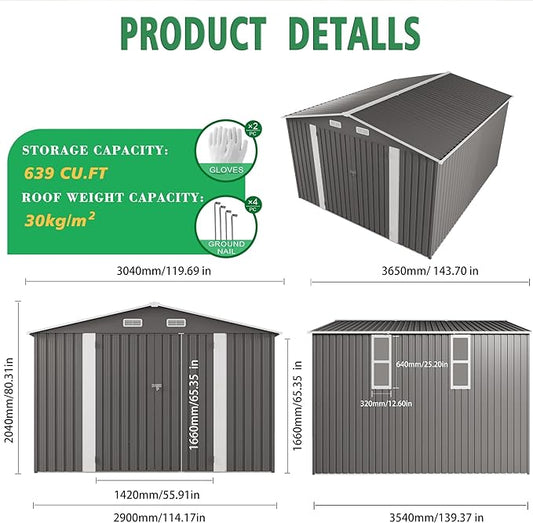 10x12 FT Metal Outdoor Storage Shed & Double Hinged Large Door - Heavy-Duty Shed with Floor, Lockable & Ventilation - Rainproof Windproof Large Utility Garden Shed for Backyard Patio Lawn
