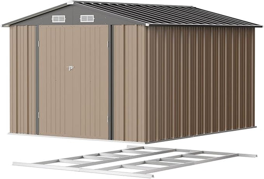 Patiowell 8x10 FT Outdoor Storage Shed with Floor Frame, Large Garden Tool Metal Shed with Sloping Roof and Double Lockable Door, Outdoor Shed for Backyard Garden Patio Lawn,Brown