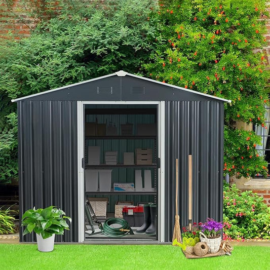 10×8 FT Metal Outdoor Storage Shed, Large Garden Sheds with Lockable Doors, All Weather Anti-Corrosion Galvanized Steel Tool House for Backyard Garden Lawn,Grey