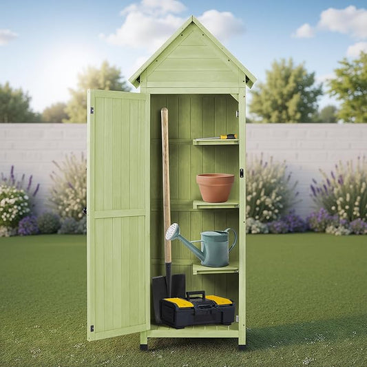 Wooden Outdoor Storage Cabinet,Tall Vertical Garden Tool Shed with Waterproof Metal Roof & Adjustable Feet – Perfect for Yard, Patio, Lawn & Deck (Green, 22" x 26" x 67")