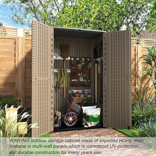 KINYING Outdoor Storage Shed Waterproof, Resin Vertical Outdoor Storage Cabinet for Patio Furniture, Garden Tools, Pool Accessories, Mower Storage (66 Cu.ft, Dark Brown)