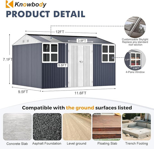 12x10 FT Metal Shed Heavy-Duty, Outdoor Storage Garden Sheds with Reinforced Steel Frame & Customizable Skylight, Weatherproof Galvanized Tool Tiny House for Backyard, Patio, and Lawn