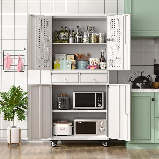 71" H Metal Garage Storage Cabinet with Wheels,Tool Storage Cabinet with Pegboard,2 Drawers and Lockable Doors for Garage, Warehouse,Home,Required Assembly,Grey and White