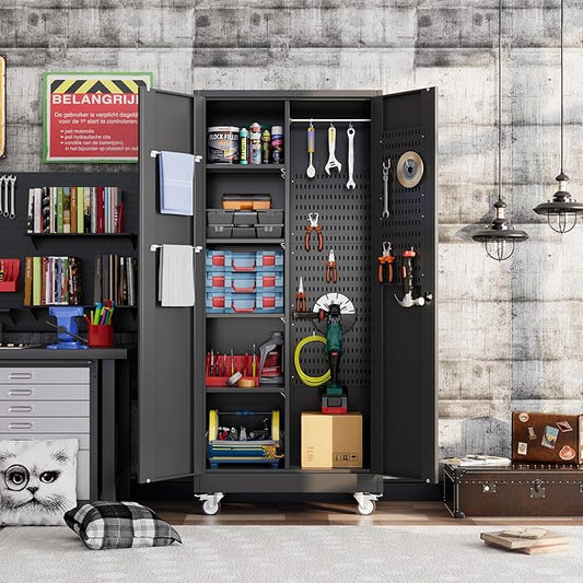Broom Closet Storage Cabinet with Wheels and Pegboard,Metal Garage Storage Cabinet with Doors and Adjustable Shelves for Garage Home,Required Assembly,Black