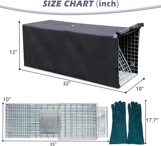 Live Animal Trap Cage with Cover and Gloves, Heavy Duty Folding Animal Traps Cage for Stray Cats, Humane Cat Trap for Raccoon, Squirrel, Skunk, Catch and Release - (32 x 10 x 12 inches)