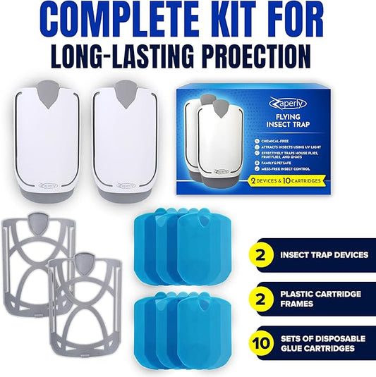2 Fruit Fly Traps & 10 Adhesive Cartridges, Indoor Plug-in Bug Catcher, UV Light Fly Trap Captures Fruit Flies, Gnats, Houseflies, Moths, and Flying Insects for Kitchen, Bathroom, Plant Areas