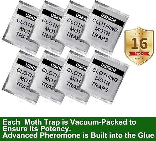 USKICH Clothes Moth Traps with Strength Pheromones |Sticky Glue Trap for Closets and Carpet Moths |Clothing Moth Traps for Feathers, Fur, Wool |Lure, Trap and Kill Case-Bearing Webbing Moths(16 Pack)
