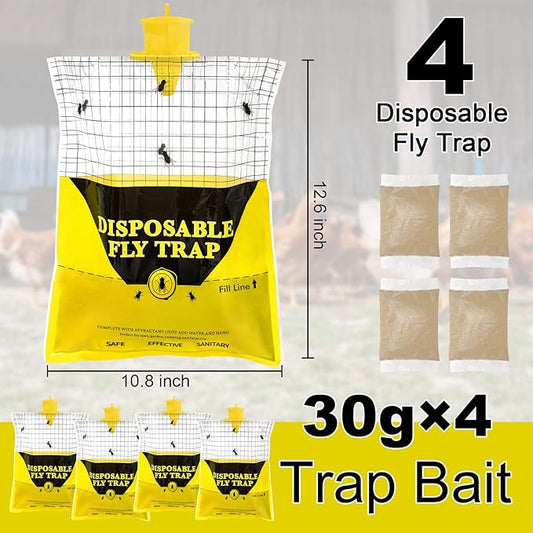 Glovv 10.8 * 12.6 Inch Fly Trap for Patio, Big Bags Outdoor Disposable 4 Pack, Hanging Fly Catcher with Bait, Hunter Stable Horse Ranch Control Repellent Killer for Barn, Farm, Mosquito, Bugs
