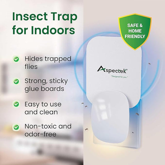 Aspectek Sticky Fly Insect Trap for Indoor, Plug-in Blue Light Bug Control with 12 Packs of Sticky Glue Pads, Night Light UV Attractant Catcher for Home,White (2 Pack)
