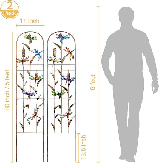 LEWIS&WAYNE 2 Pack Metal Garden Trellis with Colorful Dragonfly 60 Inch High Outdoor Decoration Arched Fence Trellis for Climbing Plants for Patio, Lawn, Yard, Backyard, Wall Brackets