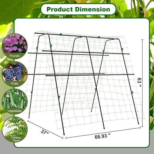 Garden Arch Trellis for Climbing Plants Vegetable Outdoor 67" x 63" A-Frame Cucumber Trellis with Climbing Netting & Plant Clip Tomato/Pea/Zucchini/Squash Trellis for Raised Garden Bed