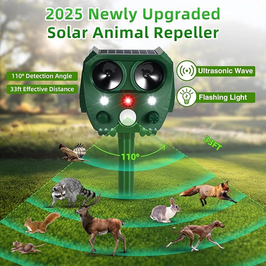 2 Pack 2025 Ultrasonic Animal Repeller Outdoor Solar Deer Repellent Devices with Motion Detection,Waterproof Squirrel Raccoon Fortress Pro Deterrent Light for Cat Skunk Rabbit Dog