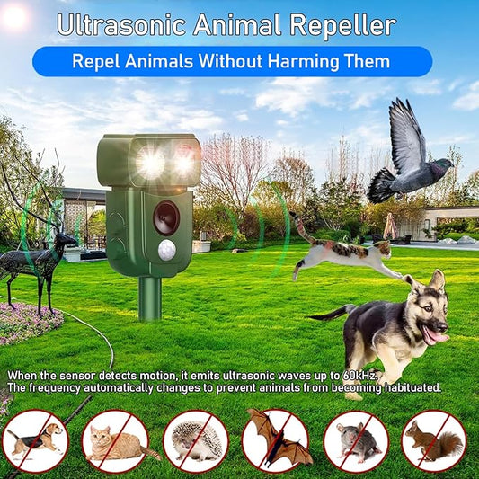 2PACK Solar Ultrasonic Animal Repellent Outdoor, Deer Repellent Devices Squirrel Cat Raccoon Rabbit Dog Deterrent, Keep Rodent Away Motion Detection with Flash Light for Yard Garden Lawn