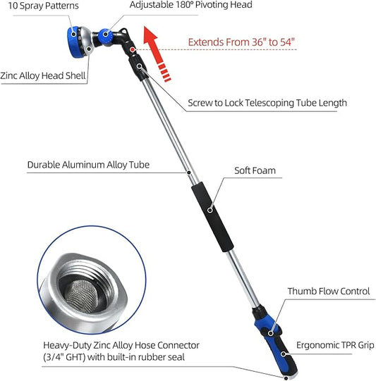 Telescoping Watering Wand for Garden Hose, 36”-54” Adjustable, 10 Spray Patterns, Heavy-Duty Hose Nozzle with Thumb Control & Pivoting Head, Ideal for Hanging Baskets and Shrubs, Blue