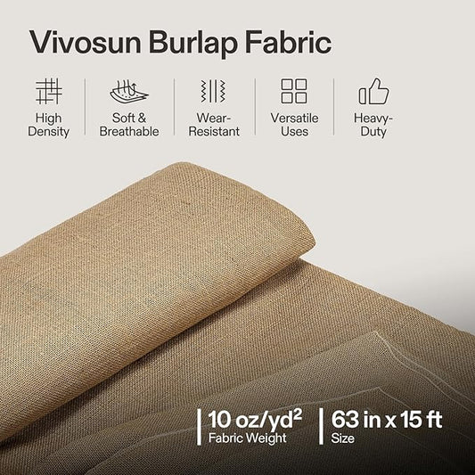 VIVOSUN 63 in x 15 ft Premium Burlap Fabric, 10 oz Heavy Duty High Density Natural Jute Fiber, Multipurpose Burlap for Gardening, Outdoor Plant Care, Weed Barrier, DIY Crafts, and Decoration