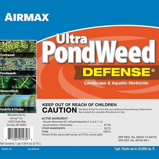 Airmax Ultra Pondweed Defense Aquatic Weed & Plant Killer, Easy Spray Application to Clean & Clear Large Pond & Lake Water, Liquid Treatment Control Concentrate, Fish, Pet & Animal Safe, 1 Gallon