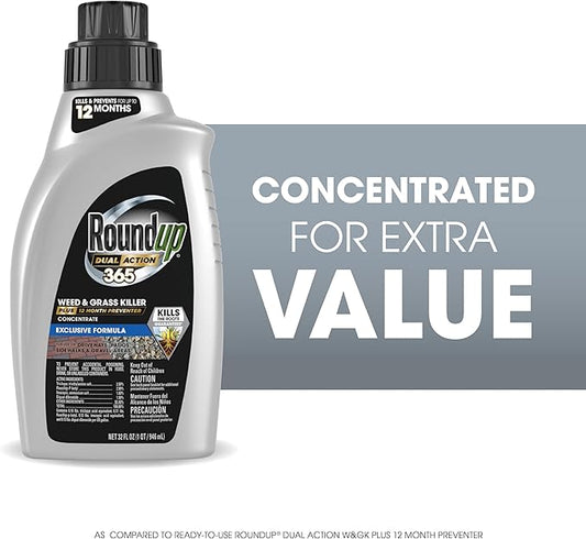 Roundup Dual Action 365 Weed & Grass Killer Plus 12 Month Preventer Concentrate, Kills & Prevents for up to 1 Year, 32 fl.oz.
