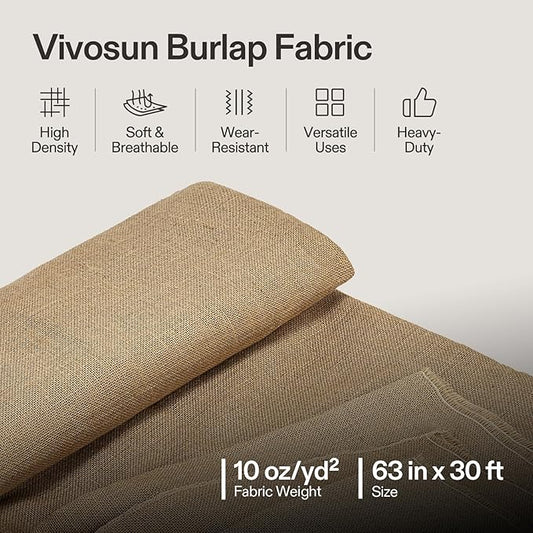 VIVOSUN 63 in x 30 ft Premium Burlap Fabric, 10 oz Heavy Duty High Density Natural Jute Fiber, Multipurpose Burlap for Gardening, Outdoor Plant Care, Weed Barrier, DIY Crafts, and Decoration