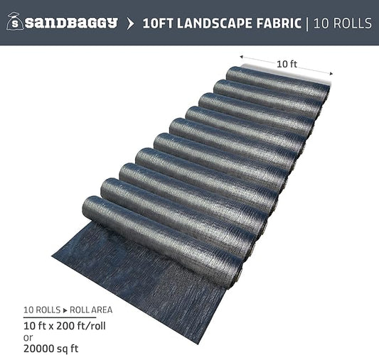 Sandbaggy 10 ft x 200 ft Landscape Fabric | 40 Year Fabric | for Weed Barrier, Ground Cover, Garden | Industrial Grade | 135 Lbs of Tensile | UV Protected | DOT Approved (10 Rolls - 10 ft x 200 ft)