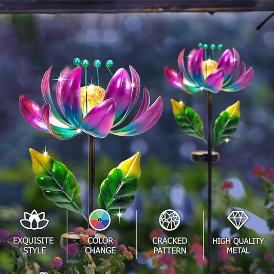 Solar Garden Lights Metal Flower Decor, Colorful Spinning Windmill Lotus Pathway Ligths with LED Cracked Crystal Ball Outdoor Decorative Stake Lighting Waterproof Flower Sculpture for Patio Yard