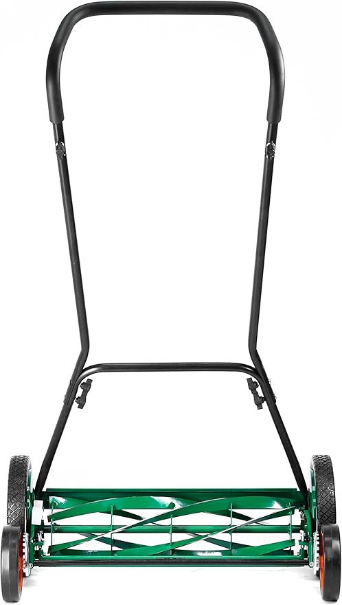 - Ergonomic handle with cushioned grip for comfort when using the Scotts 20 inch 5-blade manual hand push no-motor reel lawn mower; Easy, tool-less assembly