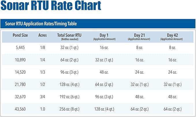 - Easy to dose just use 4 quarts per 1/2 acre (4-6ft depth avg)