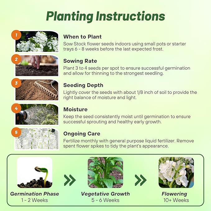 - COMPACT & VERSATILE GROWTH: Ten Week White Stock Flower Seeds grow to a height of 14 inches, making them suitable for small garden spaces, containers, or as edging plants. They perform well in full sun and well-drained, gritty soil and are suitable for USDA Zones 3 - 10. While typically grown as annual seeds, they can also grow as perennial seeds in areas with mild winters.