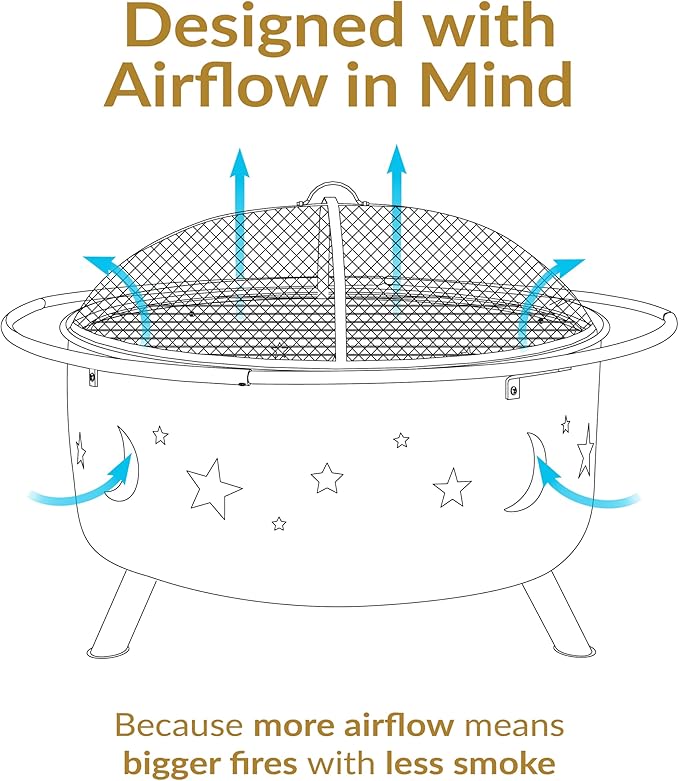 - HEAVY DUTY AND RUST RESISTANT: The backyard fire pit is made from durable steel and is finished with a rustic, high-temperature paint for long-lasting quality and added resistance to rust. The fire pit is lightweight and portable, allowing it to be moved anywhere easily. It has decorative star and moon cutouts that complement any outside decor style.