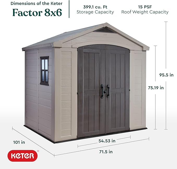 Keter Factor (8x6 ft) Large Resin Outdoor Storage Shed for Patio Furniture, Lawn Mower, Garden Accessories Yard Tools, and Pool Toys, Taupe