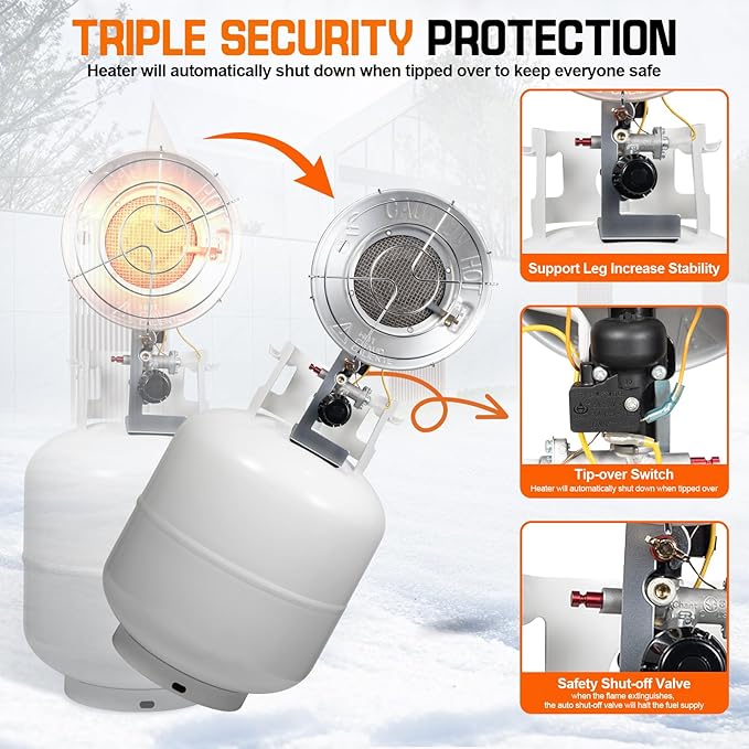 - Safety Propane Tank Top Heater: This portable heater camping features safety mesh guards designed to prevent burns. It includes a tip-over switch that automatically shuts off the gas flow if the heater is accidentally knocked over. The safety stop valve will cut off the gas flow when the heater is extinguished. Certified by the CSA, this propane heater undergoes rigorous inspection to ensure it meets the highest safety standards, giving you peace of mind during use.