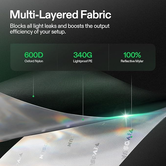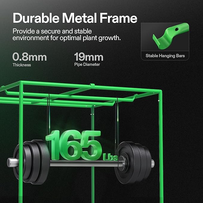 - Sturdy Build & Extra-Thick Materials: The indoor tent features robust metal poles, top bars, and tool-free corner connectors, securing the structure; The top bar supports up to 165 lbs., meeting various equipment needs; Made from premium 340g high-density fabric, the tent is waterproof, tear-resistant, and double-stitched for excellent light blockage; The inside lining designed with PE lining and Mylar walls, ensures a safer environment for your plants