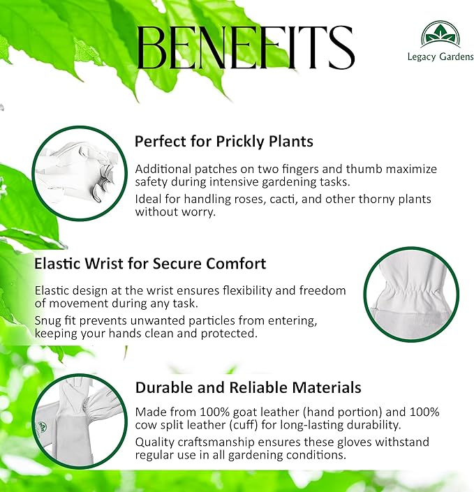 - Thorn Resistant Leather Garden Gloves - Crafted with A-grade goatskin leather for exceptional puncture resistance, these long gloves keep your hands secure from rose thorns, rough rocks, and prickly plants. Ideal for rose pruning and yard work.