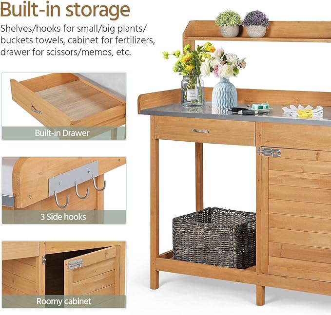 Yaheetech Outdoor Garden Potting Bench Table Work Bench Metal Tabletop W/Cabinet Drawer Open Shelf Natural Wood