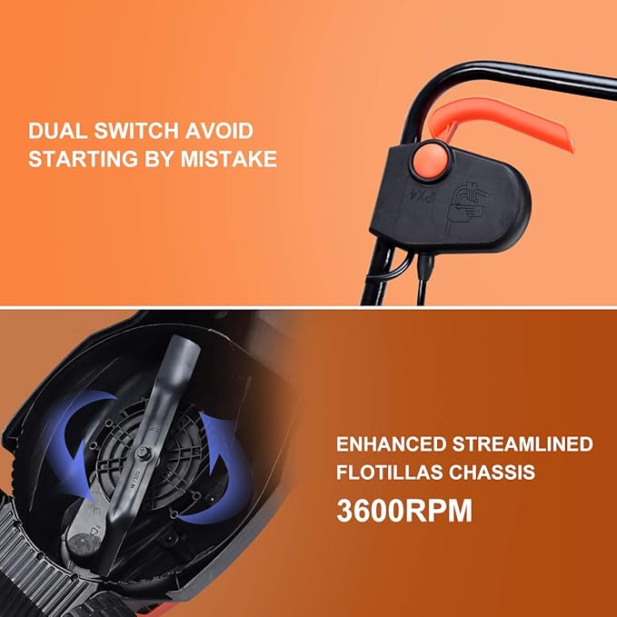 - 【Easy & Safe Push-Button Start 】The walk-behind lawn mower can be easily started by pressing the dual switch buttons on the handle, without the need for oil or gas. This dual switch design not only makes this corded lawn mower convenient to operate, but also ensures user safety, perfect for people with no operating experience.