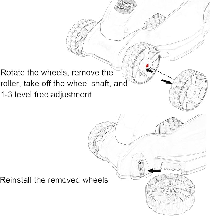 - 【Adjustable Cutting Height】3-level adjustable cutting height: 1”, /1.6'', /2.2'' always provides the perfect cut on all types of grass, which is also easy to adjust through wheels. And equipped with four big 5.5” wheels, the corded lawn mower is certain to provide smooth and stable cutting performance, also labor-saving to operate on grass.