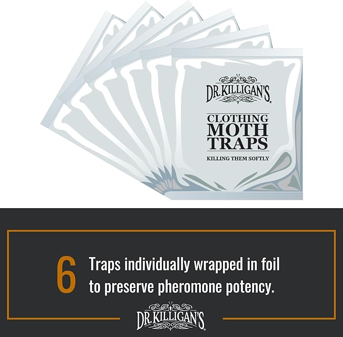 - Design Options — Dr. Killigan's moth traps boast an attractive appearance while being a safe (when used as directed) alternative to moth balls for closet. When buying a 6-pack of Premium Clothing Moth Traps, you have the choice between two distinct design options. Regardless of your selection, each trap features the same exclusive, highly effective pheromones and top-quality adhesive.