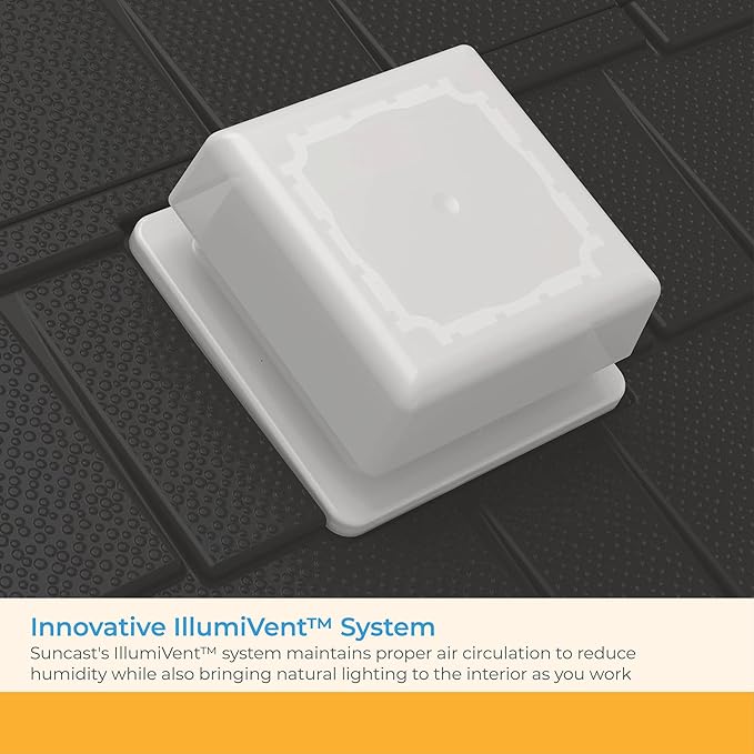 - INNOVATIVE ILLUMIVENT SYSTEM: Suncast's IllumiVent system helps maintain proper air circulation to reduce humidity and air temperature while also bringing natural lighting to the interior as you work