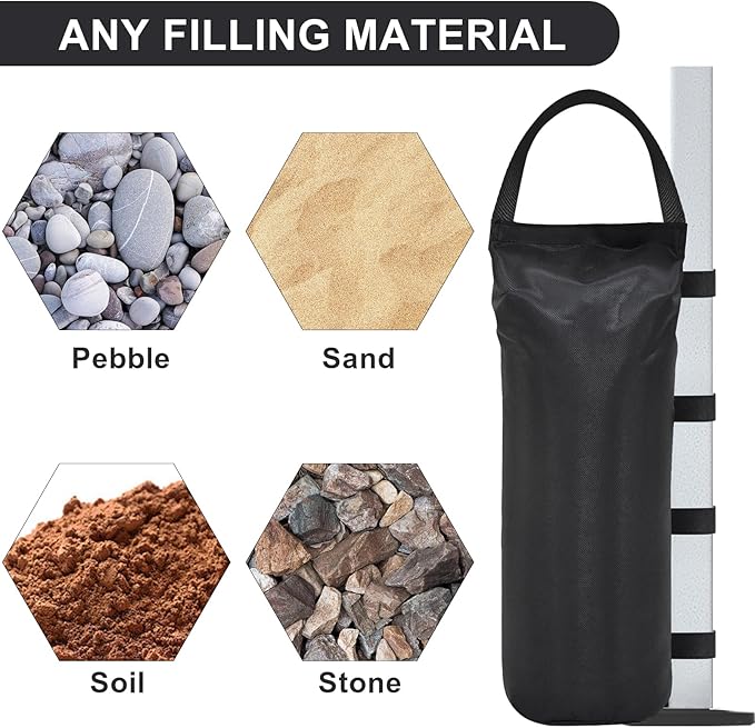 - Multi-Functional:These sand bags are suitable not only for canopy tents and Pergolas but also for umbrellas, flags, outdoor banners, and more, making them perfect for any outdoor event.
