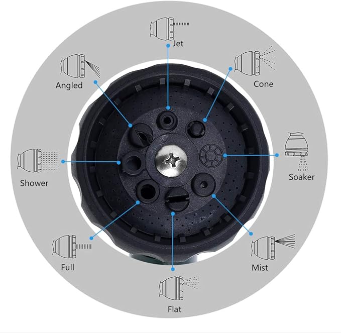 - ADJUSTABLE SPRAYER PATTERNS. GREEN MOUNT garden hose wand has 8 adjustable watering patterns: Jet, Angled, Full, Soaker, Mist, Flat, Cone and Shower. Use the 'flat' to pressure wash the debris off the patio, the 'jet' to water things across the yard, the 'soaker' to water potted plants, the 'shower' to water the lawn, the ‘mist’ to water flowerbeds and seedbeds. This spray wand does the entire garden effortlessly