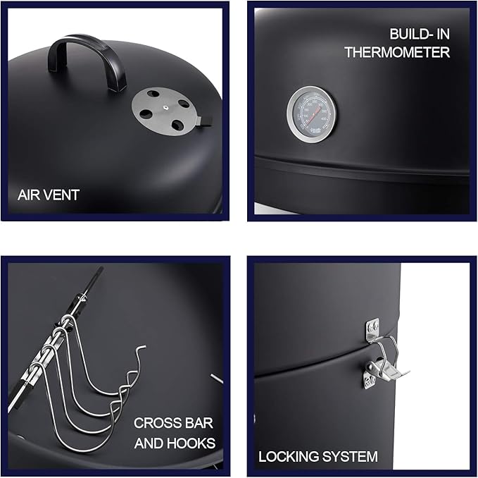 - 【COOKING SPACE】 - 2 pieces cooking grids provide total 453 square inches cooking space. With crossbar and 4 hangers inside the lid, you can smoke different sizes and shapes of meat.