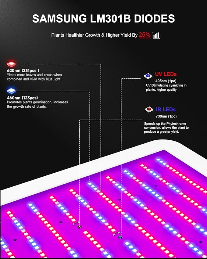 - Grow Lights for Indoor Plants Full Spectrum: According to the light compensation point and saturation point of the plant(MJ),the more suitable spectrum of the plant(MJ) was proportioned.Total 360 LEDs included 460nm,620nm,730nm(IR) and 396nm(UV) which can replace natural sunlight.UV diodes stimulate anthocyanins,which improve the quality of fruits and flowers.
