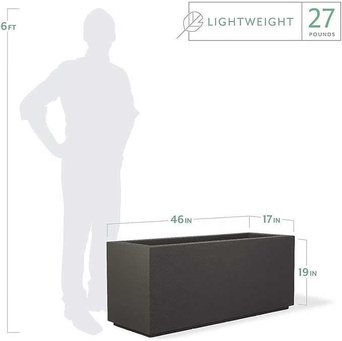 - FEATURES/DIMENSIONS: 46L x 17W x 19H tall planter equipped with drainage holes and exit channels. Suitable for indoor or outdoor use. Due to pre-drilled drainage holes, faux plants are recommended for indoor use.
