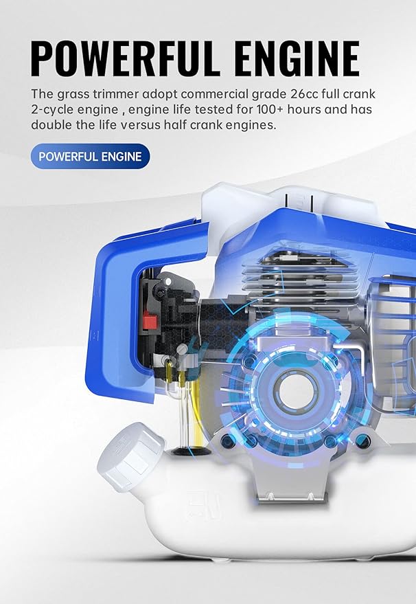 - Strong Powerful Engine: 26 cc Full Crank 2-cycle engine Gas Powered.