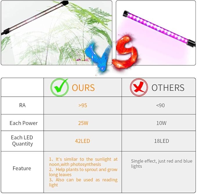 - 【6000K Growing Light/Reading Lamp】Eqqiuped with 5 Red+37 Sunlight White LEDs in each bar,which is similar to the sunlight at noon,and ideal for all sorts of indoor plants at all growth stages.Also,this 6000K LED lights provides exceptional color-rendering up to 95 ,it is flicker-free and soft light, which is very suitable for you to read at night.