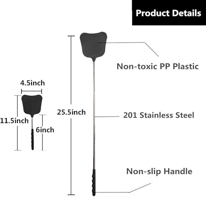 - LONG EXTENDABLE POLE: Flyswatter boasts a long extendable pole made from Stainless steel, which is durable and sturdy . It may reach 25 inches in length and no flies will escape even in far.